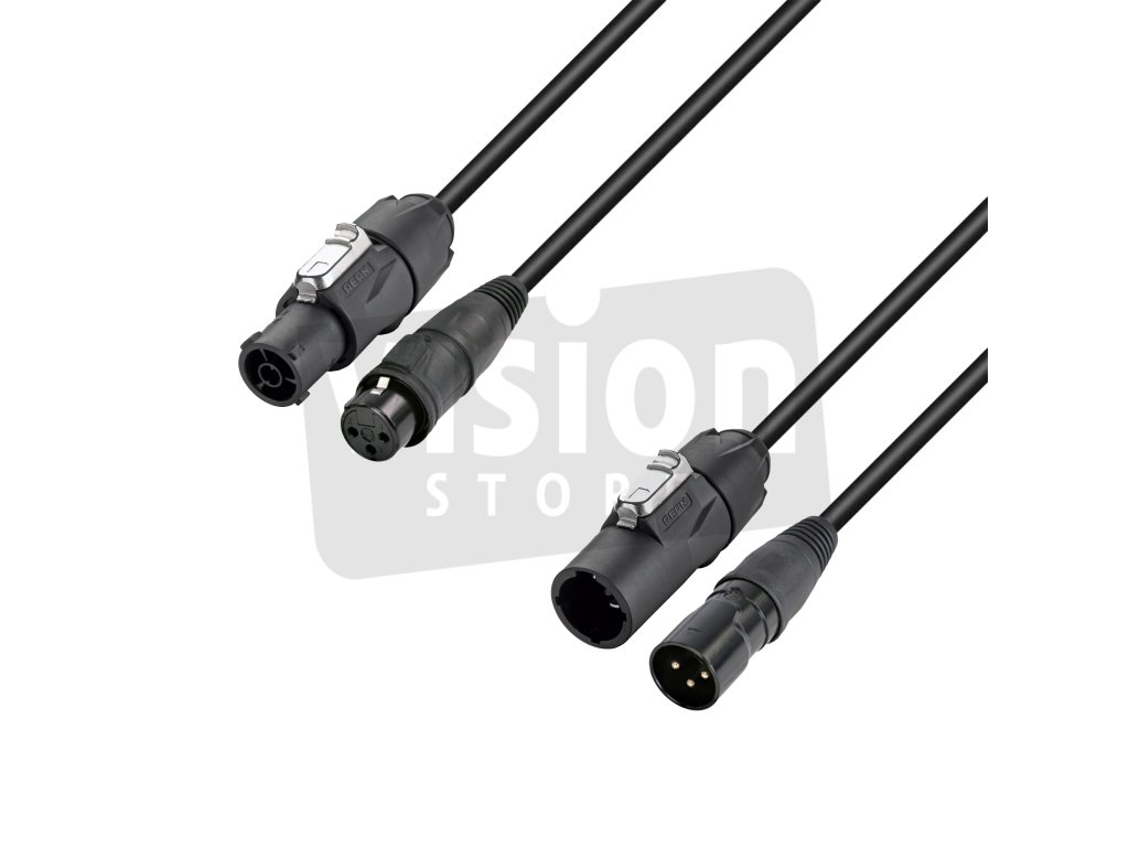 Kabel je vybaven originálními 3pinovými XLR konektory Rean® pro přenos signálu a robustními napájecími konektory Rean® řady X (kompatibilními s Neutrik® TRUE1), lze jej zapojit pod zátěží, splňuje normy a má certifikaci IP65 – je vhodný pro vnitřní i venkovní použití. Samostatné průřezy vodičů zajišťují stabilní a bezporuchový přenos: 2 × 0,22 mm² pro DMX a 3 × 1,5 mm² pro napájení.