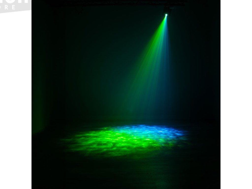 Dynamický efekt připomínající vodu, LEDzdroj 120W s dlouhou životností 50 000 hodin, možností stmívání 0–100 % (prostřednictvím DMX), manuálně nastavitelný zoom a zaostřovací objektiv, napájení (AC 120–240 V 50/60 Hz) s příkonem 125W.