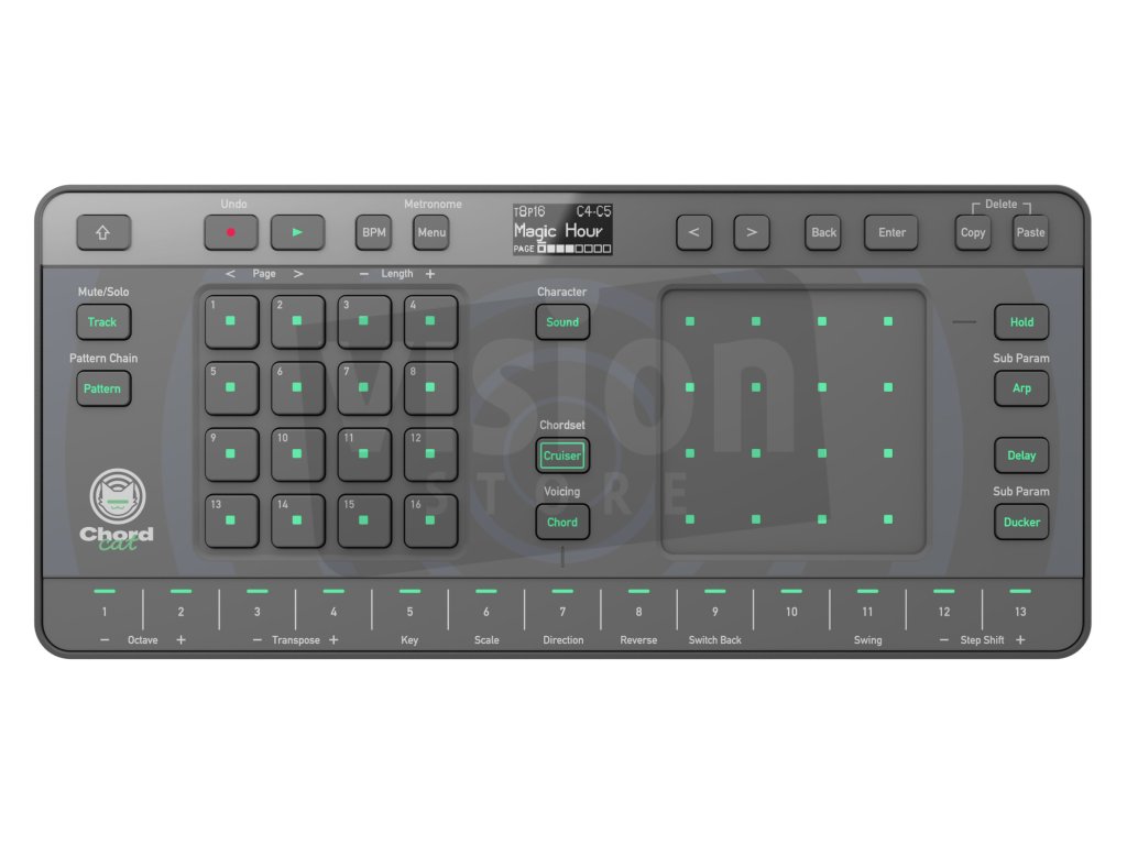 Režim Chord Cruiser ti pomocí chytrého algoritmu nabídne desítky hudebně ladících akordů, ze kterých si jednoduše vybereš ten pravý. Akord si přiřadíš ke klávese a groovebox ti hned navrhne další – hudba tak vzniká přirozeně a bez záseků. Ideální pro producenty, skladatele i úplné začátečníky.
