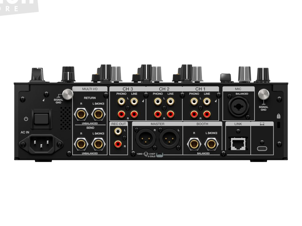 Výstup: MASTER × 1 (XLR), BOOTH × 1 (1/4palcový TRS konektor), REC OUT × 1 (RCA), PHONES × 2 (1/4palcový / 3,5 mm)