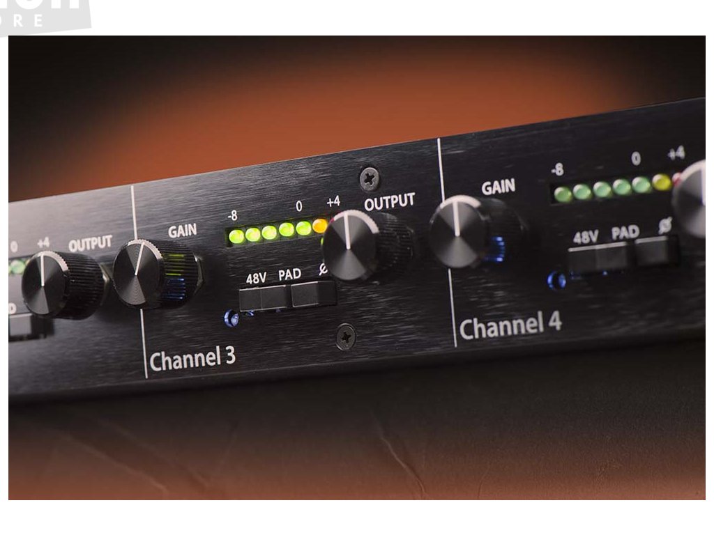 čtyřkanálový mikrofonní předzesilovač s Hi-Z vstupy