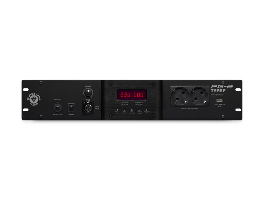 - High Current (zařízení s vysokým odběrem) - pro připojení aktivních monitorů nebo výkonových zesilovačů. Tento okruh je vybaven obvodem pro časovou prodlevu při zapnutí i vypnutí. Tím je zajištěno, že vaše monitory, zesilovače nebo aparáty se zapnou jako poslední a jako první se zase vypnou. Zabráníte tak nepříjemnému a pro výškové reproduktory i nebezpečnému „prasknutí“. Celou svou sestavu/rack/studio tak můžete zapínat a vypínat centrálně pouze stisknutím jediného tlačítka - spuštěním PG-2 F.