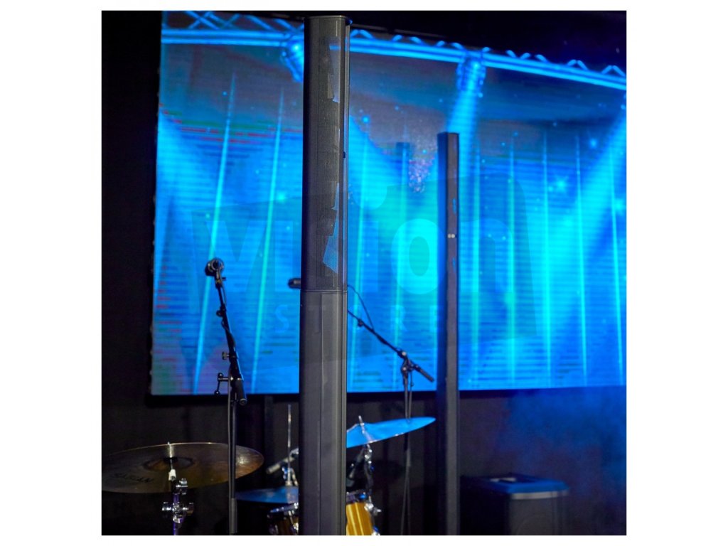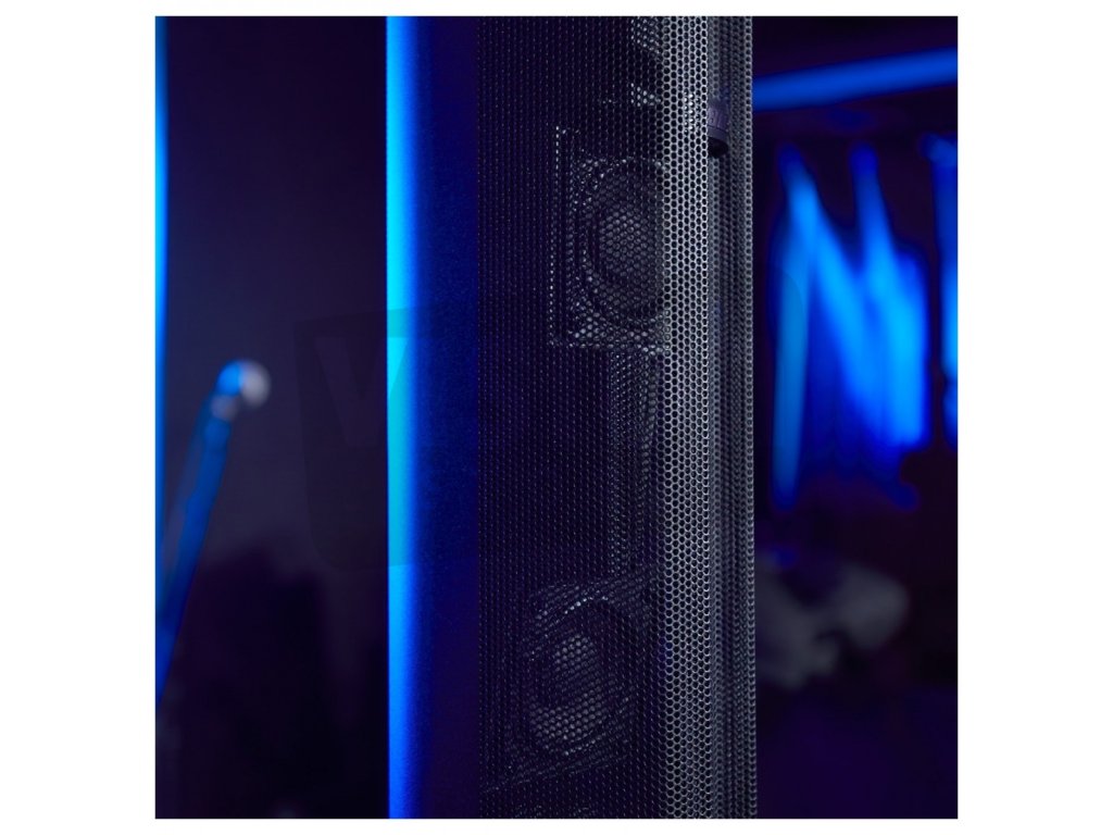 - Line array technologie: Systém obsahuje osmičlánkové C-formát line array uspořádání reproduktorů, které poskytuje rovnoměrné rozptylové pokrytí 180° v horizontální rovině a minimalizuje pokles zvuku na větší vzdálenost.