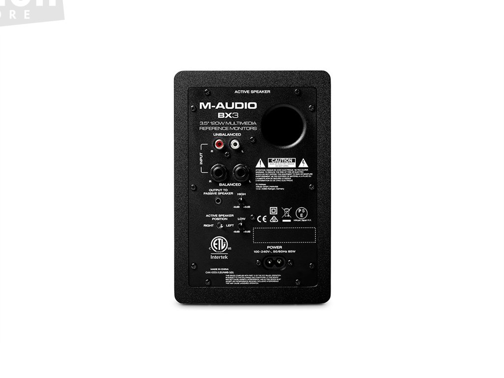 M-Audio BX3 jsou studiové monitory, nabízející přesný referenční zvuk za vynikající cenu. Zabudovaný 3,5" karbonový woofer a 1" tweeter zajišťují perfektní poslech a perfektně se hodí jak pro studiovou produkci a poslech, tak i pro běžná multimedia. Možnost volby levé/právé strany a 100W výkonu dělají z BX3 jasnou volbu pro amatéry i profesionály.