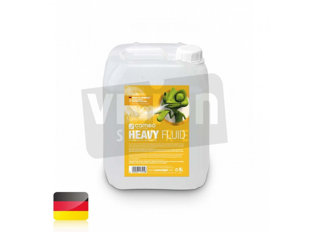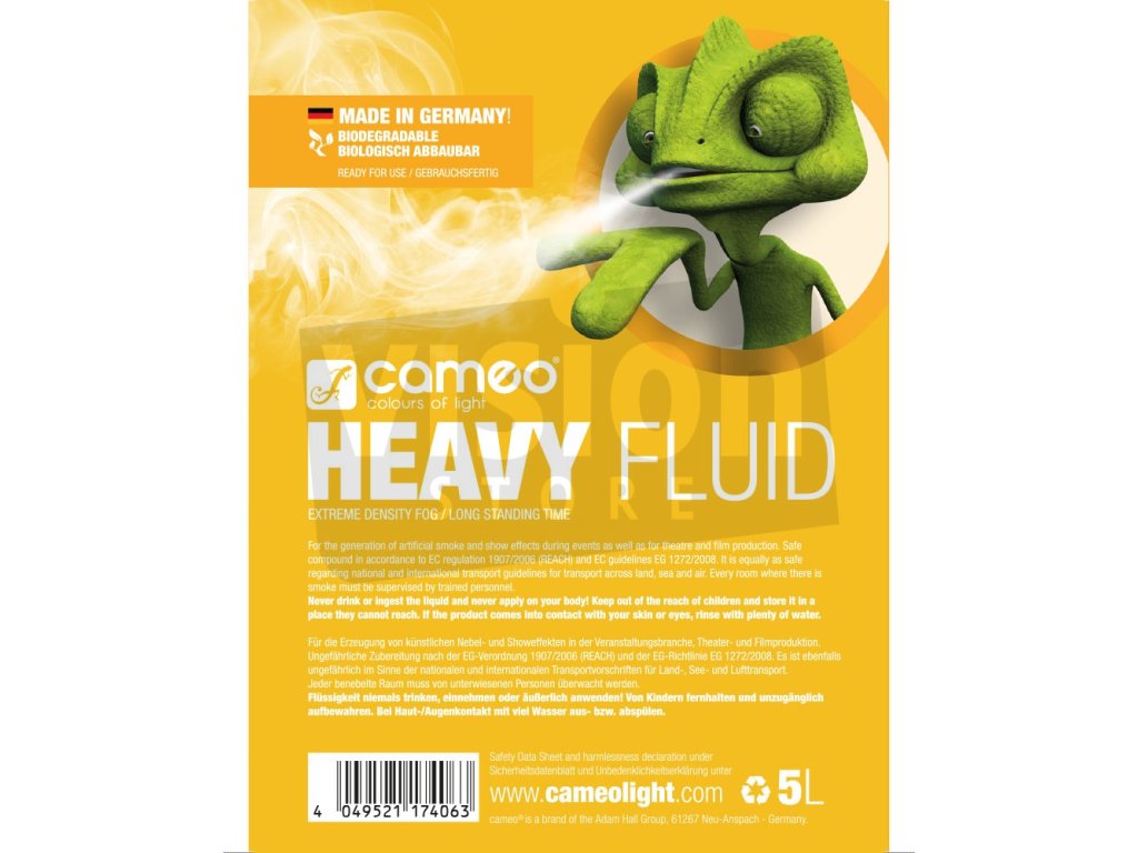 Cameo Heavy Fluid je formulován pro všechny běžné mlhovače a vytváří obzvláště hustou a dlouhotrvající bílou mlhu. Je okamžitě připraven k použití, bez zápachu a díky své vynikající reflexní schopnosti ideální pro velkolepé světelné a laserové show.