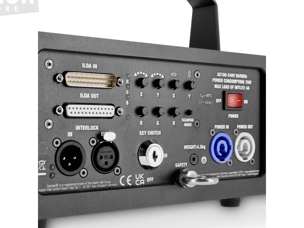 Plně diodový laser, výstupní výkon 3 000 mW (R: 600 mW, G: 800 mW, B: 1600 mW), Galvo skener 25 Kpps při 8° ILDA, Ovládání přes ILDA, Vstup a výstup Neutrik PowerCON