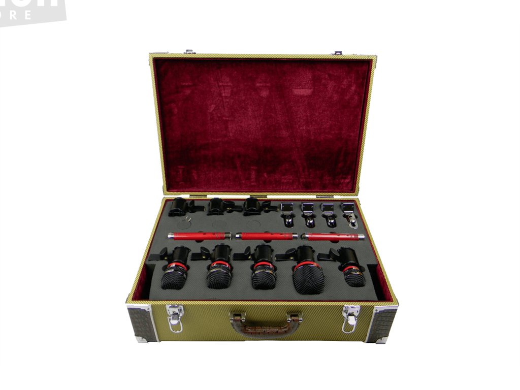 - 8 mikrofonů včetně odpružených držáků a držáků na okraje bubnů.
