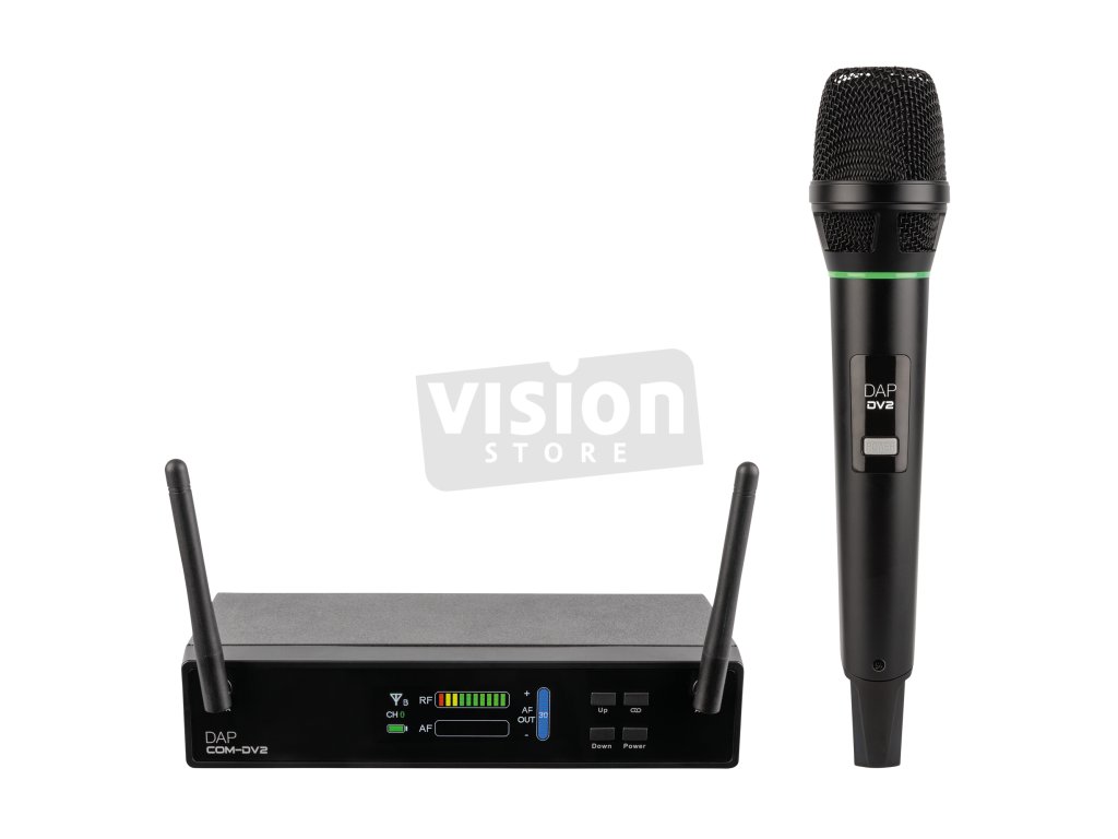 DAP COM DV-2 je bezdrátový ruční mikrofon pracující v bezlicenčním pásmu 2,4 GHz. Mikrofon je vybaven dynamickou hlavou s 8 nastaveními zesílení. Interní 24bitový/48kHz převodník připravuje audio signál pro bezdrátový přenos s nízkou latencí. Ruční mikrofon má LED indikátor stavu, který pohodlně zobrazuje jeho aktuální provozní stav. Na dva AA baterie může vydržet až 10 hodin.