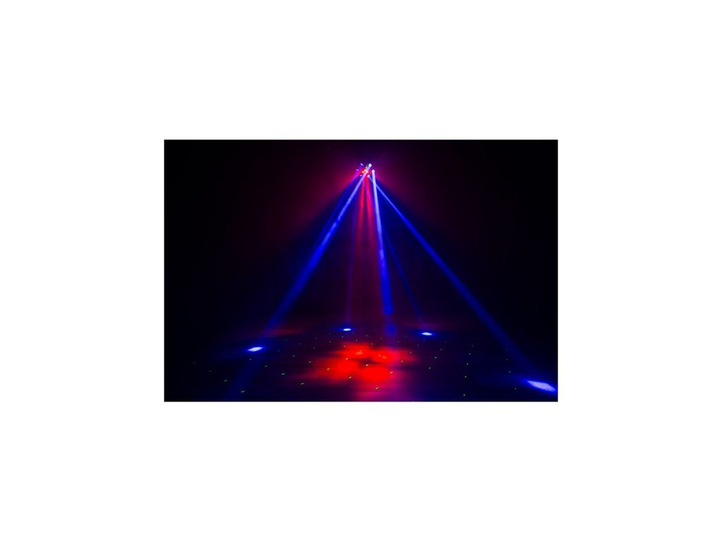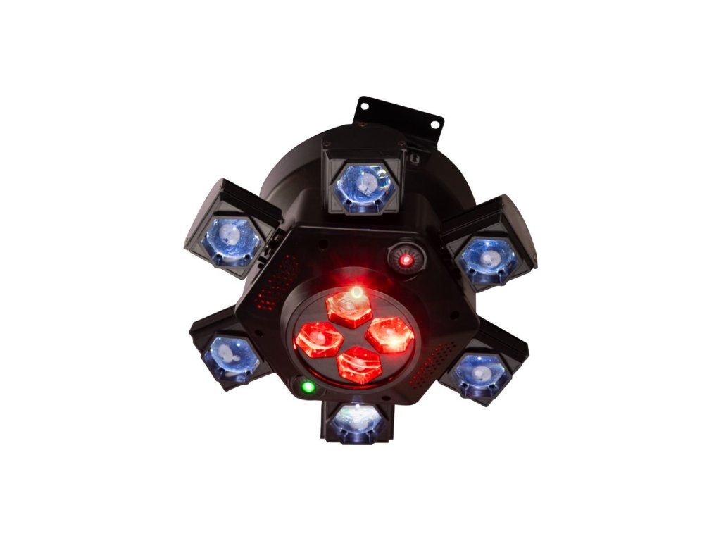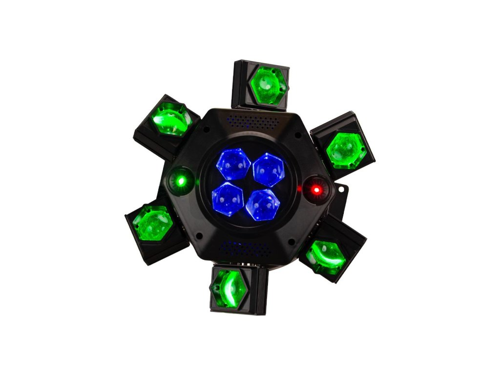 CenterDroid je vysoce působivý světelný efekt, navržený tak, aby naplnil místnost pohybem, barvou a energií. CenterDroid kombinuje výkonné RGBW LED zdroje s přesnými červenými a zelenými laserovými paprsky a vytváří tak vrstvené vizuální efekty, které se rozprostírají od svítidla do vzduchu a napříč tanečním parketem. Deset vysoce výkonných 15W CREE RGBW LED diod poskytuje bohaté míchání barev, plynulé přechody a výrazné efekty paprsků, zatímco integrované lasery generují ostré vzdušné vzory a dynamické projekce, které umocňují hloubku a atmosféru.