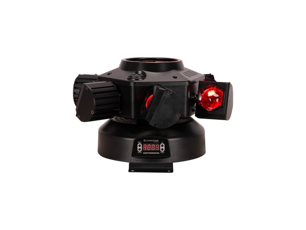 CenterDroid, navržený pro vizuální efekty řízené pohybem, je vybaven naklápěcími rameny a otočnou sestavou středové čočky, která neustále mění tvar paprsků, barevných vzorů a červených a zelených laserových paprsků. Výsledkem je neustále se vyvíjející zobrazení vzdušných efektů a pokrytí podlahy, které udržuje publikum v napětí a nabíjí prostor energií – ideální pro noční kluby, bary a DJ vystoupení.