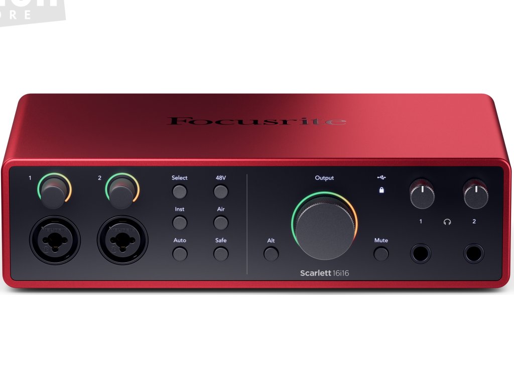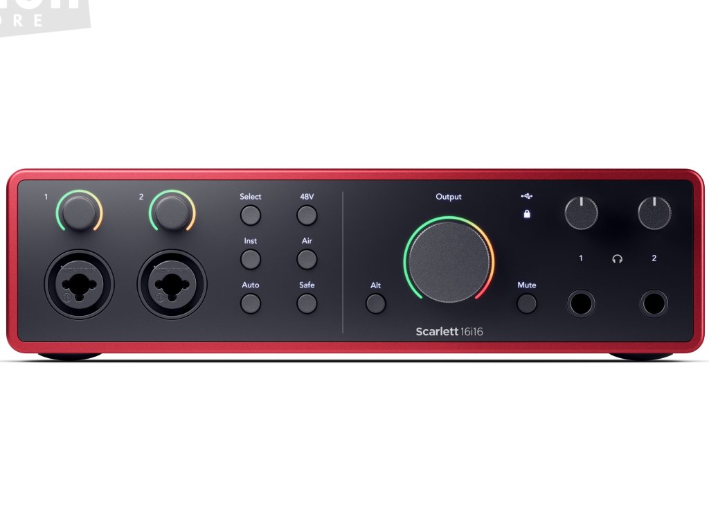 Focusrite Scarlett 16i16 4th Generation je USB-C audio rozhraní se 16 vstupními a 16 výstupními kanály. Analogovou část tvoří 2 hlavní kombinované vstupy pro mikrofon, linkové nebo nástrojové signály a další 4 linkové vstupy jsou k dispozici na zadním panelu. Analogový výstup zahrnuje 4 kanály a umožňuje připojení dvou párů studiových monitorů s možností jejich přepínání tlačítkem Alt. K dispozici je rovněž dvojice sluchátkových výstupů s individuální možností nastavení hlasitosti a dále plnohodnotné rozhraní MIDI. Digitální periferie disponuje optickým rozhraním ADAT pro připojení dalších 8 kanálů na vstupu i výstupu, případně stereo SPDIF.
