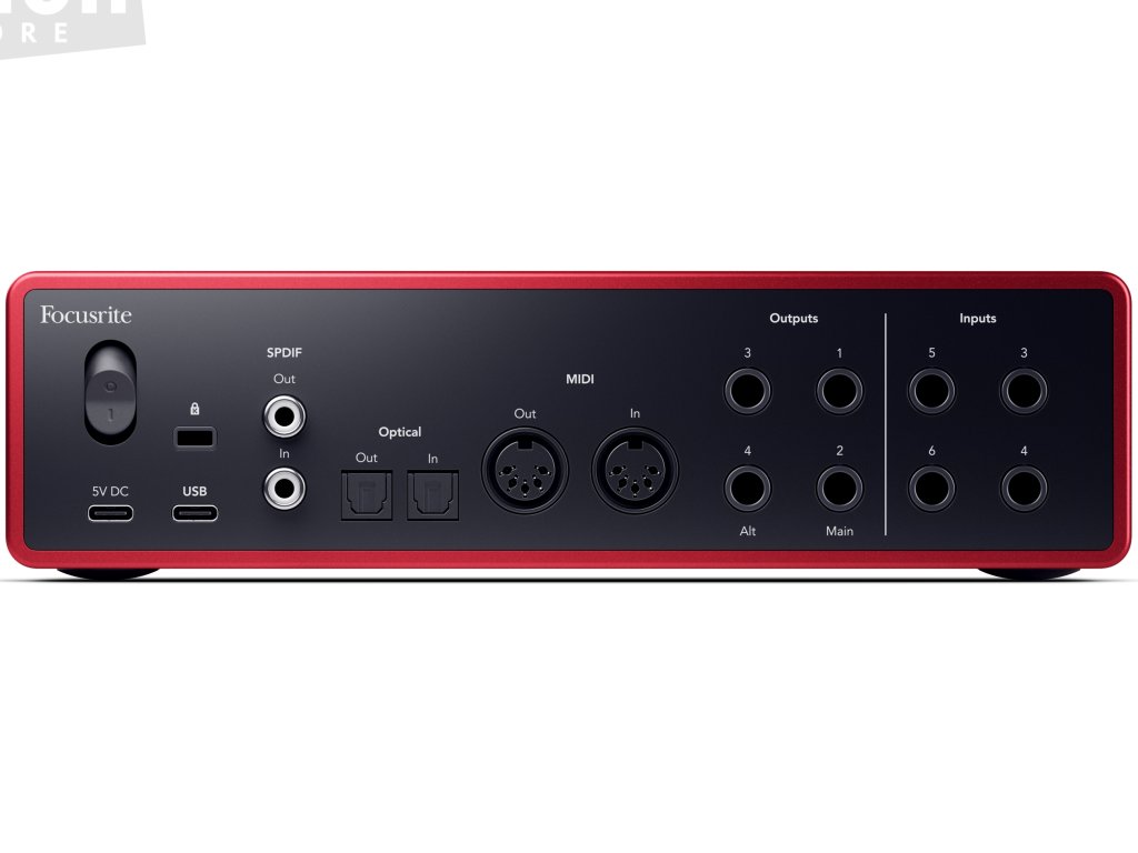 USB-C audio rozhraní se 16 vstupními a 16 výstupními kanály. Analogovou část tvoří 2 hlavní kombinované vstupy pro mikrofon, linkové nebo nástrojové signály a další 4 linkové vstupy jsou k dispozici na zadním panelu. Analogový výstup zahrnuje 4 kanály a umožňuje připojení dvou párů studiových monitorů s možností jejich přepínání tlačítkem Alt. K dispozici je rovněž dvojice sluchátkových výstupů s individuální možností nastavení hlasitosti a dále plnohodnotné rozhraní MIDI. Digitální periferie disponuje optickým rozhraním ADAT pro připojení dalších 8 kanálů na vstupu i výstupu, případně stereo SPDIF.