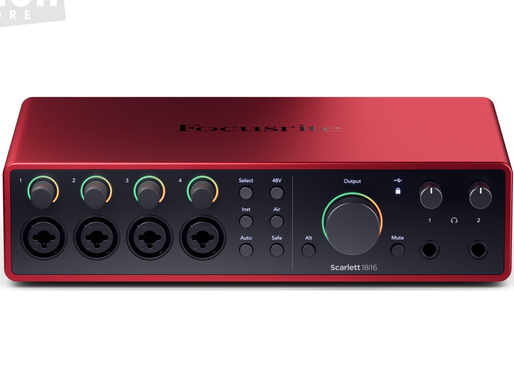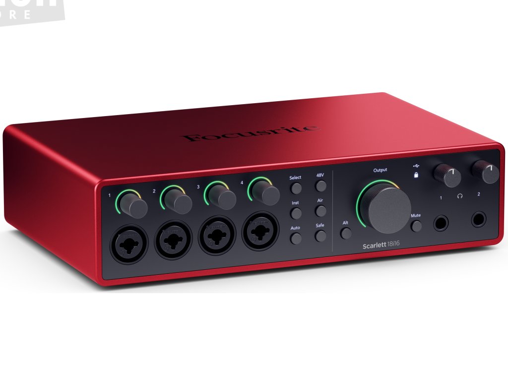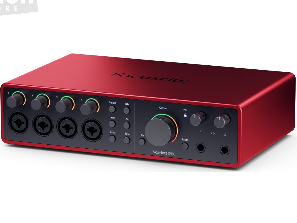 Focusrite Scarlett 18i16 4th Generation je USB-C audio rozhraní s 18 vstupními a 16 výstupními kanály. Analogovou část tvoří 4 hlavní kombinované vstupy pro mikrofon, linkové nebo nástrojové signály a další 4 linkové vstupy jsou k dispozici na zadním panelu. Analogový výstup zahrnuje 4 kanály a umožňuje připojení dvou párů studiových monitorů s možností jejich přepínání tlačítkem Alt. K dispozici je rovněž dvojice sluchátkových výstupů s individuální možností nastavení hlasitosti a dále plnohodnotné rozhraní MIDI. Digitální periferie disponuje optickým rozhraním ADAT pro připojení dalších 8 kanálů na vstupu i výstupu, případně stereo SPDIF.