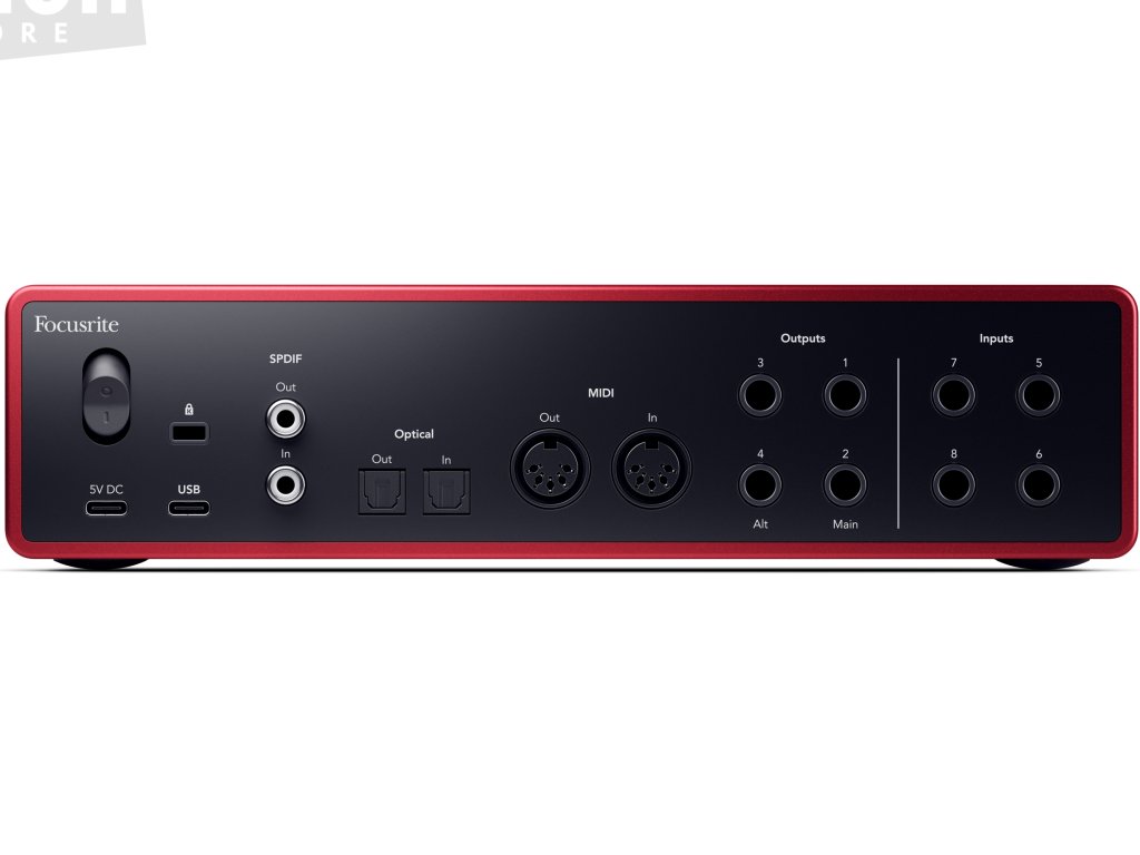 USB-C audio rozhraní s 18 vstupními a 16 výstupními kanály. Analogovou část tvoří 4 hlavní kombinované vstupy pro mikrofon, linkové nebo nástrojové signály a další 4 linkové vstupy jsou k dispozici na zadním panelu. Analogový výstup zahrnuje 4 kanály a umožňuje připojení dvou párů studiových monitorů s možností jejich přepínání tlačítkem Alt. K dispozici je rovněž dvojice sluchátkových výstupů s individuální možností nastavení hlasitosti a dále plnohodnotné rozhraní MIDI. Digitální periferie disponuje optickým rozhraním ADAT pro připojení dalších 8 kanálů na vstupu i výstupu, případně stereo SPDIF.