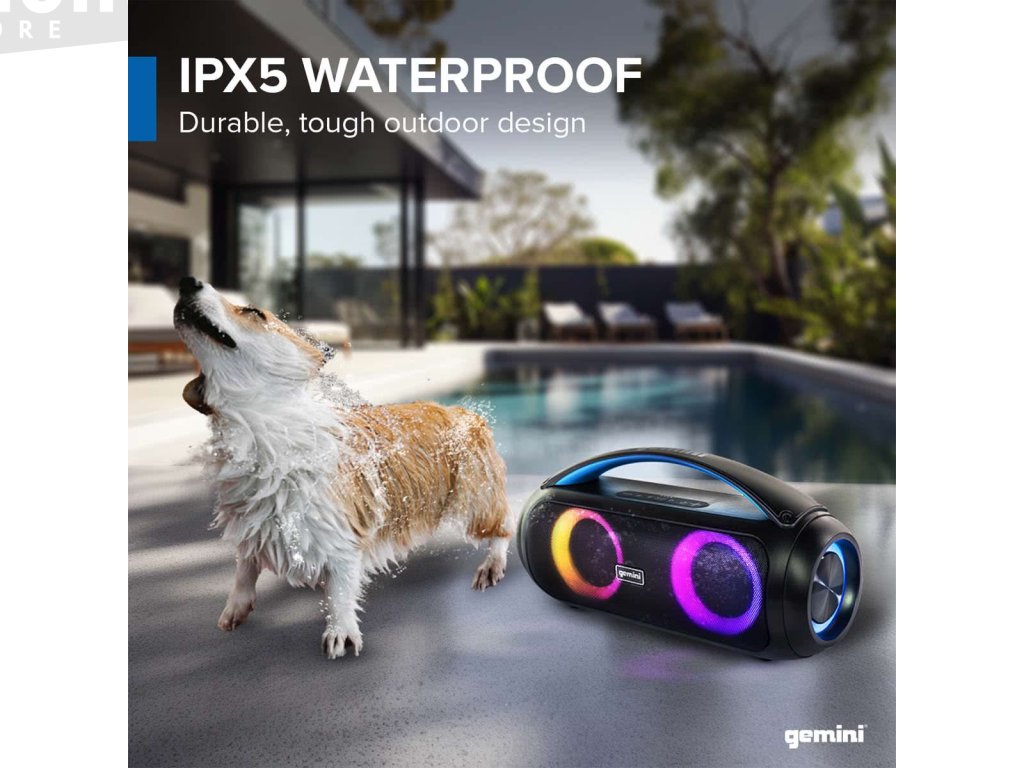 Gemini GGO-230L je voděodolný přenosný Bluetooth reprobox vybavený dobíjecí baterií pro bezdrátový provoz. Díky stupni krytí IPX5 odolává stříkající vodě u bazénu a venkovním podmínkám. Voděodolná konstrukce je ideální pro výlety na pláž, grilování na zahradě, kempování a domácí párty.