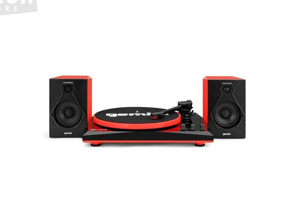 stereofonní systém tvořený gramofonem a 2 reproboxy v černo-červeném provedení