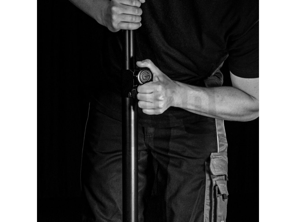 Těžké podmínky a extrémní časový tlak na turné jsou určeny pouze pro silné pracovníky a robustní materiály - jako je reproduktorový stojan řady Gravity Touring. Extrémně robustní, se třemi dvojitě vyztuženými nohami a montážním držákem z tlakově litého hliníku. Obzvláště pevné ocelové trubky pro nosnost 50 kg. Nastavení a sejmutí je extrémně rychlé a bezpečné díky automatickému zaklapávacímu zámku LockPin®. Prodlužovací tyč 35 mm je zajištěna na místě a čep lze odblokovat pouze uvolňovací pákou. Stojan na reproduktor lze nastavit do výšky až 194 cm. Aretační šrouby s pevnými, neztratitelnými kovovými knoflíky jsou neocenitelnou výhodou při cestování.