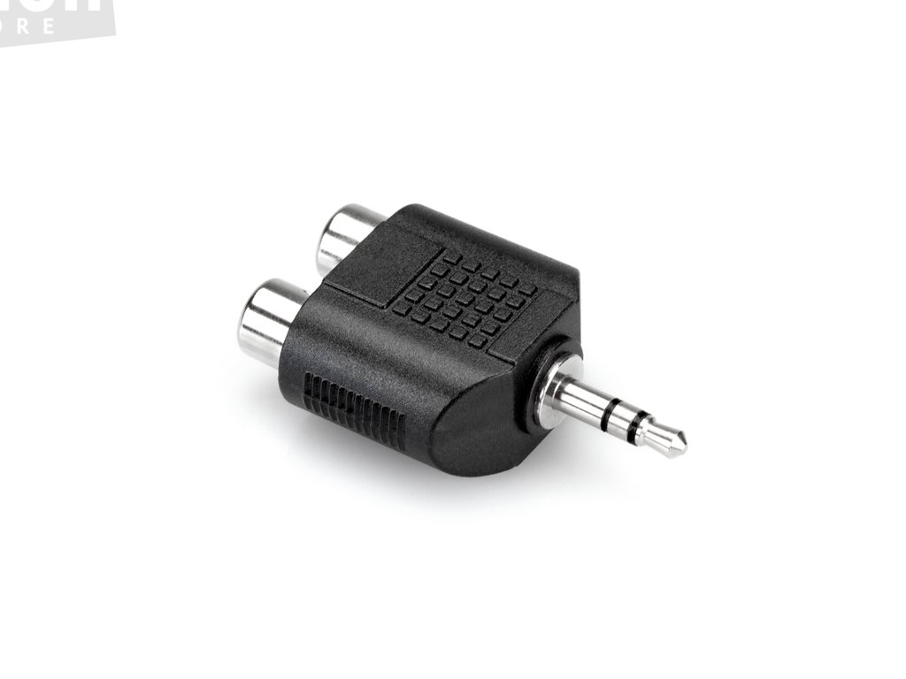 Adaptér s konektory 2x RCA / 3.5 mm TRS. Určen k redukci stereofonního kabelu s dvěma konektory RCA na jeden 3,5 mm TRS konektor.