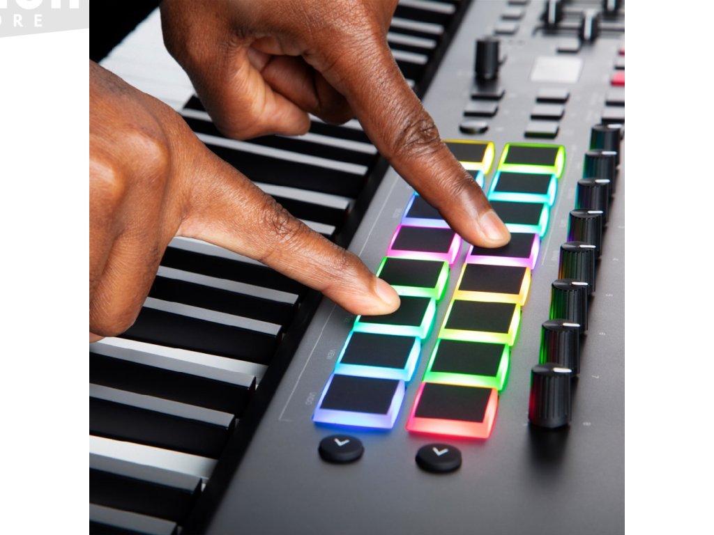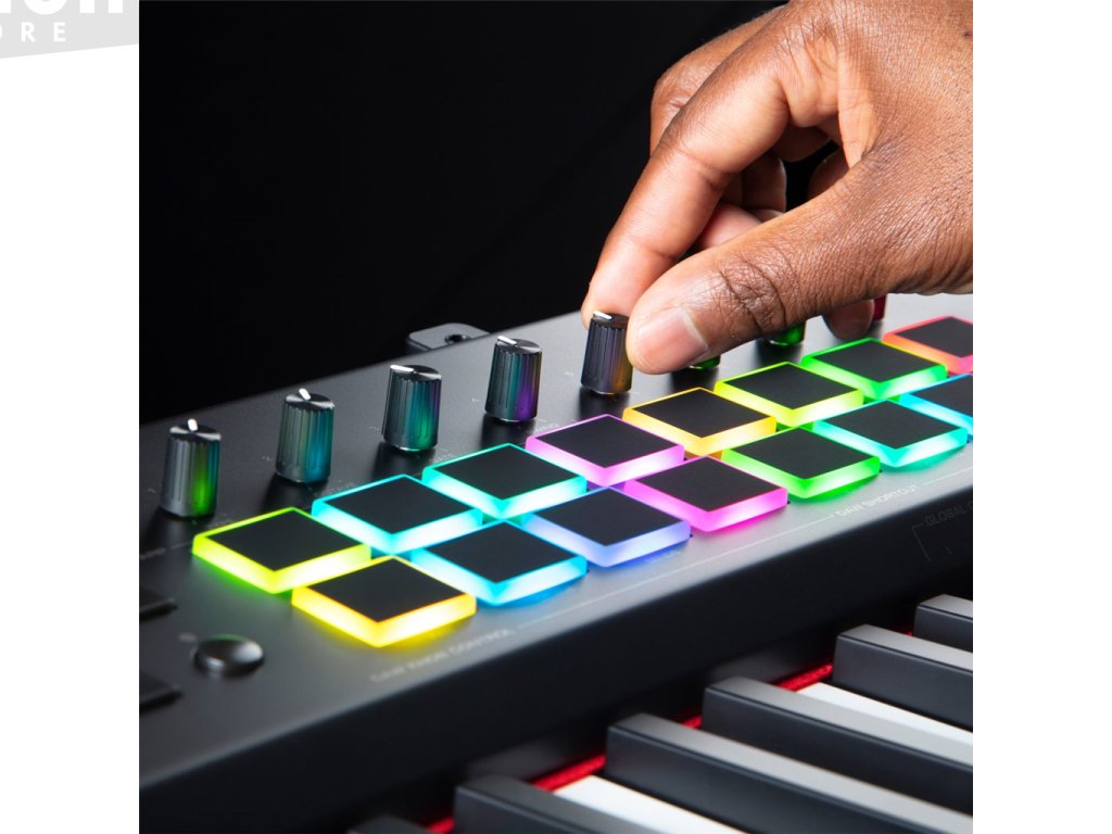 - 16 RGB plně mapovatelných padů s note repeat pro beat produkci, spouštění klipů atd.