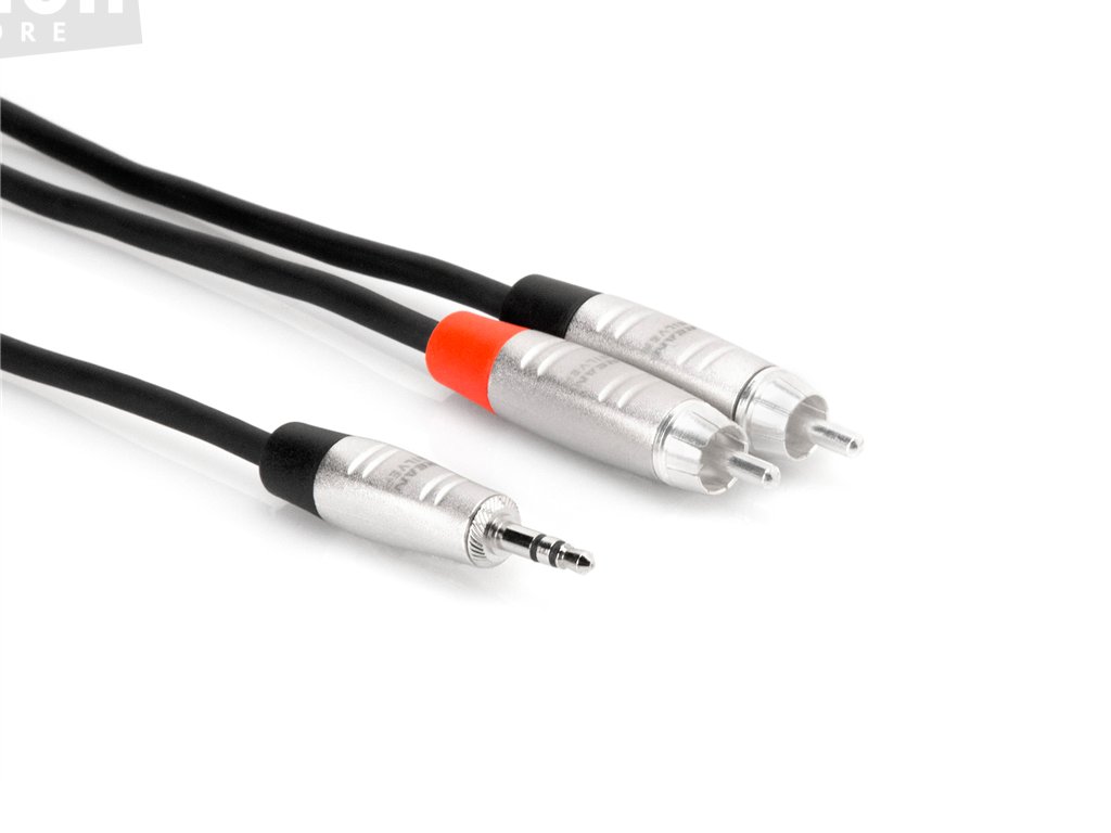 Stereo breakout kabel Hosa Pro s konektory REAN 3.5 mm TRS / 2x RCA. Určen pro připojení digitálního audio přehrávače a pod. k stereo systému. Délka 1,8m.