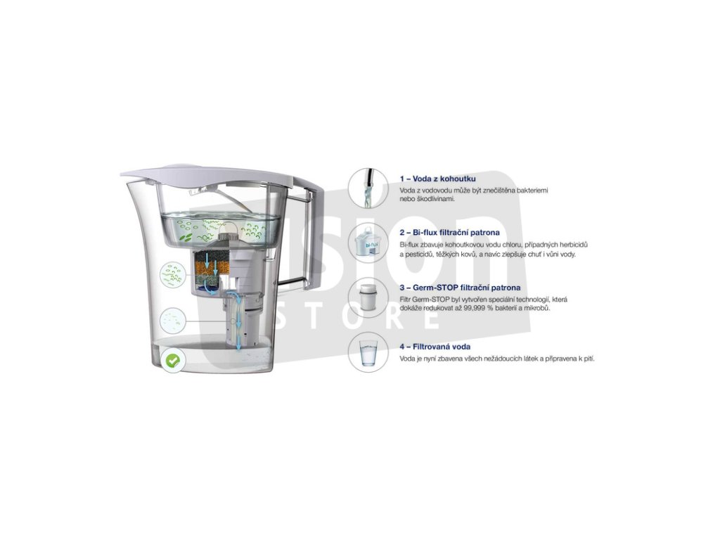 Filtrační konvice pro odstranění bakterií a mikrobů • objem zásobníku: 3 l • objem filtrované vody: 2 l • manuální indikátor • vyrobeno v Itálii • QuickFill otvor • bez BPA • 1 Bi-flux + 1 Germ-STOP