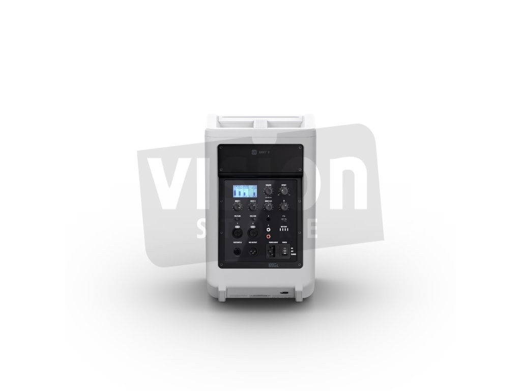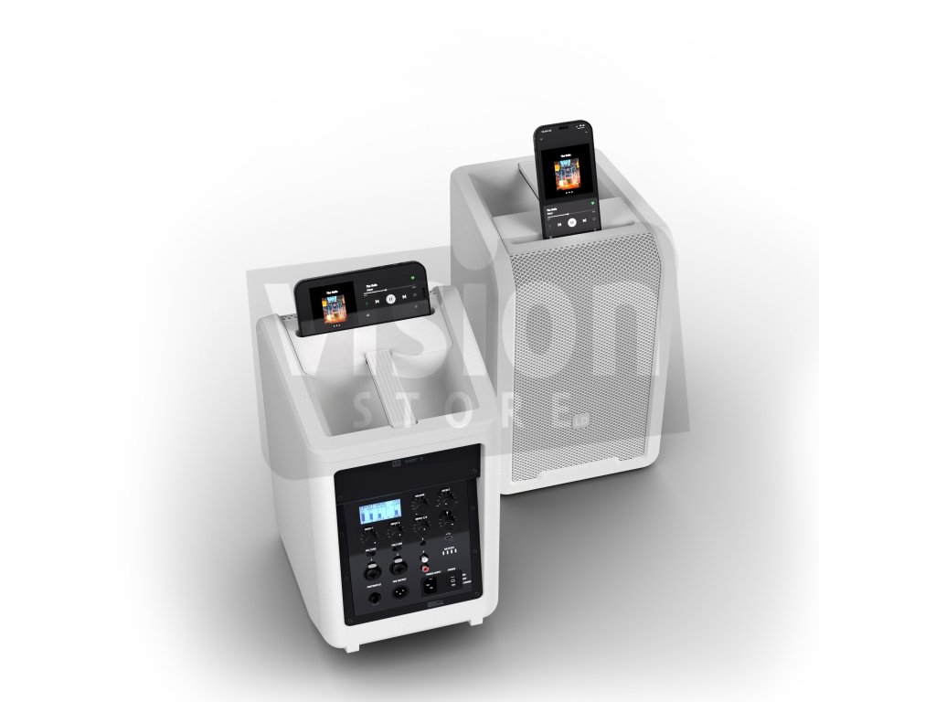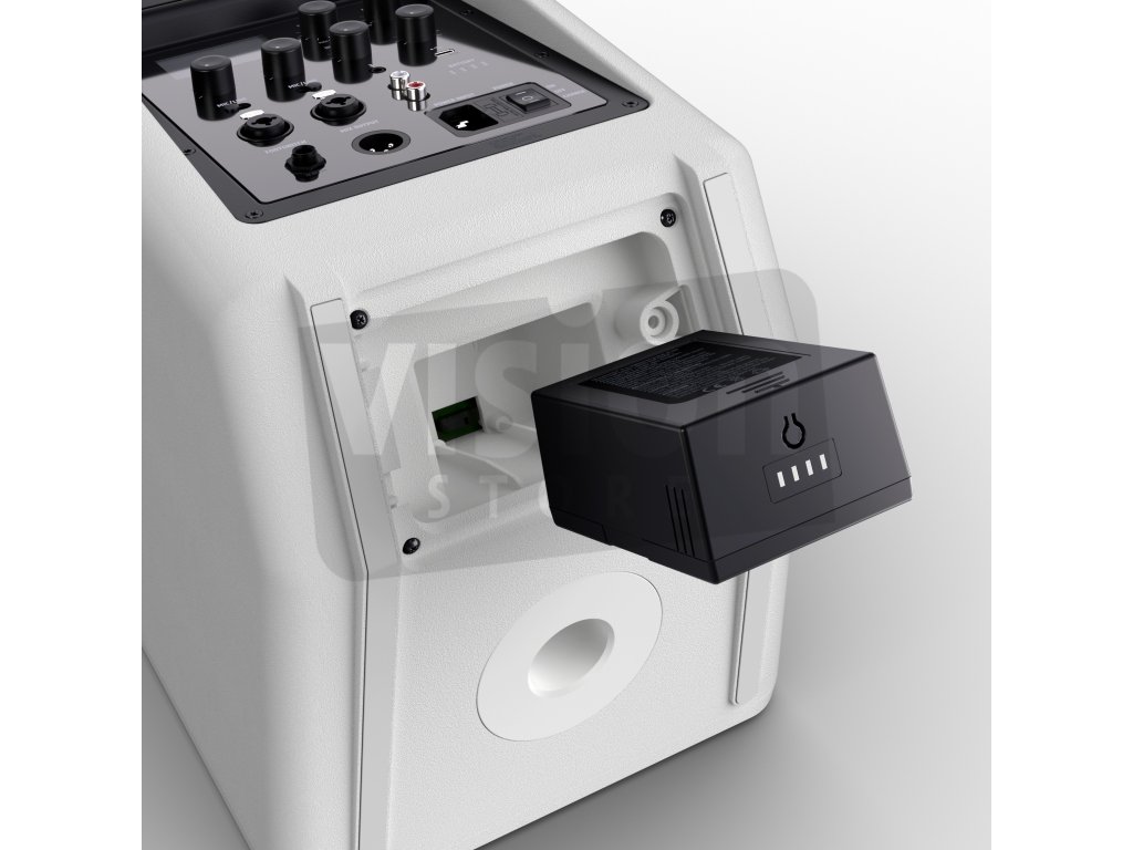 Přenosný bateriový 8" Bluetooth PA reproduktor s 5ti kanálovým mixpultem, výkon 80/160W, baterie 14,8V / 5Ah Li-Ion s dobou nabíjení 5 hod a výdzží až 11 hod,stereo streaming (TWS) mezi dvěma ANNY,USB-C port pro nabíjení tabletu nebo smartphonu,35mm příruba pro použití s reproduktorovým stojanem, barva Pure White, hmotnost 8,8 kg