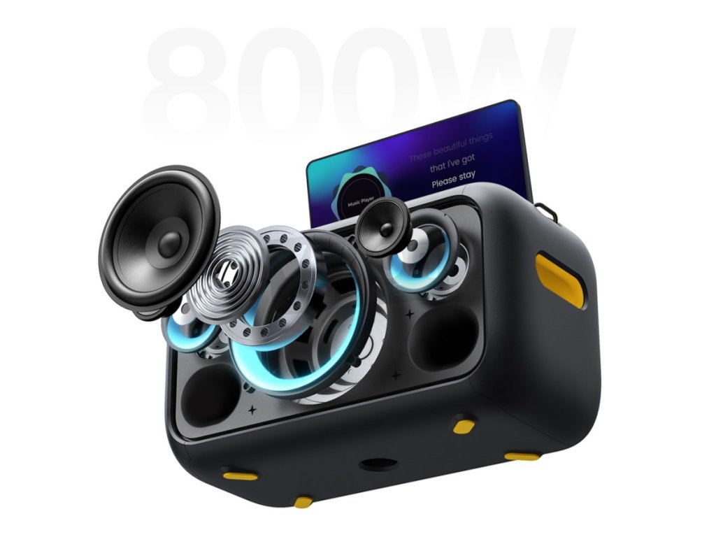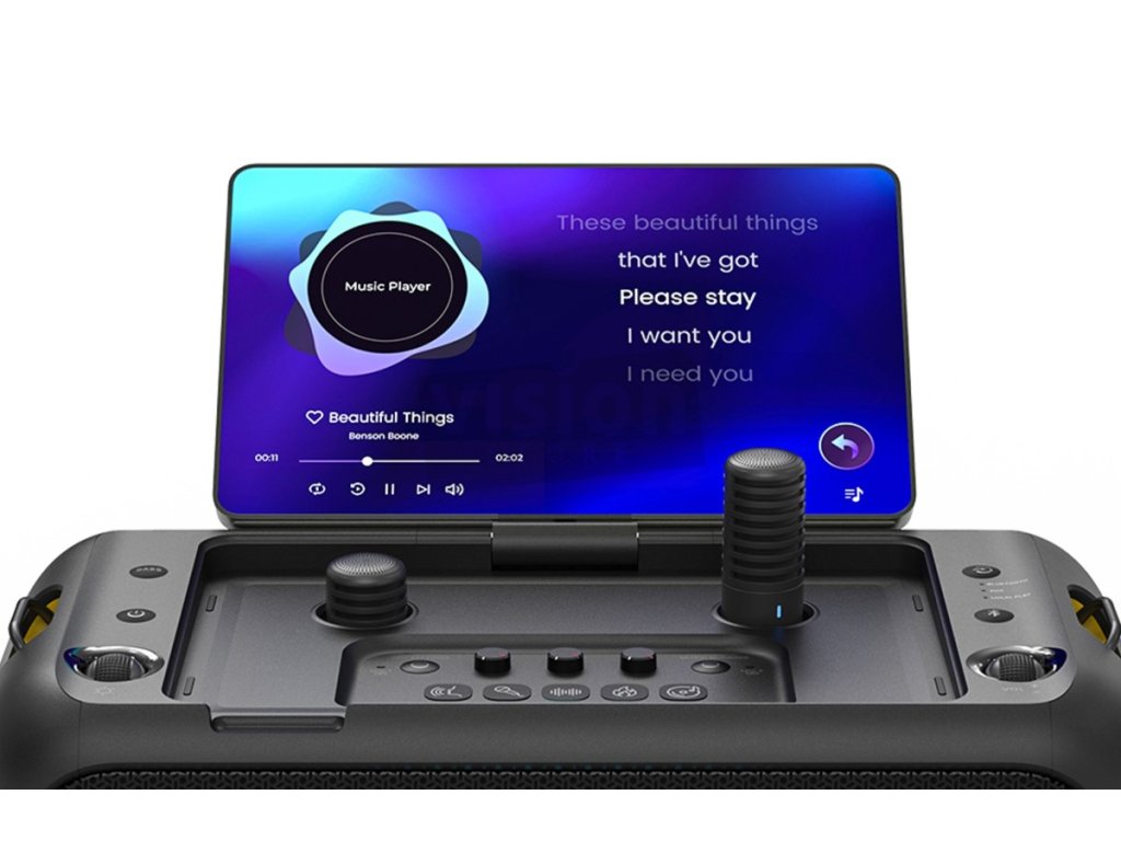 Sada reproduktorů nabízí frekvenční rozsah od 45 Hz až do 20 kHz. Součástí reproduktoru je dvojice bezdrátových karaoke mikrofonů, abyste se mohli podělit o své hudební nadání se svými přáteli. Integrovaná 4 800 mAh baterie zajistí až 6 hodin přehrávání hudby (s nastavenou hlasitostí na 60 %) a její nabíjení je možné skrze dodávaný napájecí zdroj 230V. Nabití reproduktoru trvá přibližně 4 hodiny. Reproduktor dále nabízí možnost využití jako powerbanky připojením telefonu do USB slotu.