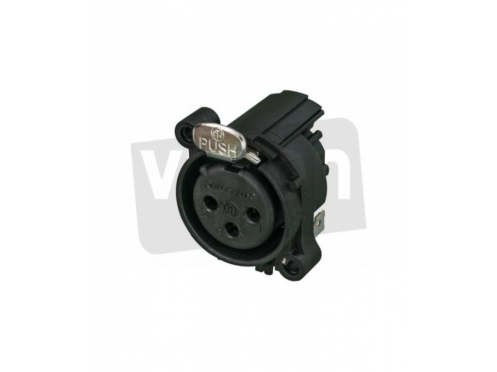 XLR female panel, plastové tělo, stříbrné kontakty, horizontální uchycení na DPS, s pojistkou, životnost 1000 cyklů