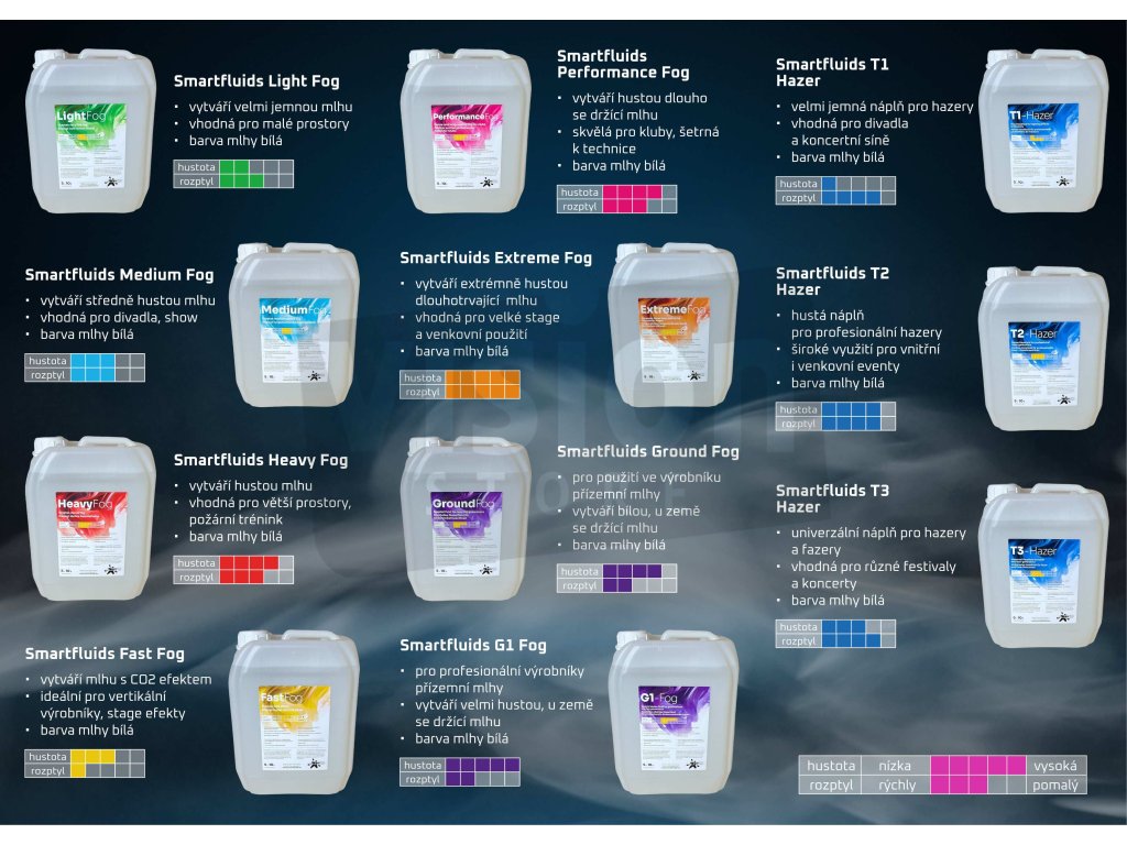 Heavy Fog – náplň vytváří hustý a dlouho se držící bílý kouř, je vhodná pro velké kluby a venkovní použití. Rovněž je velmi často využívaná pro lasergame.