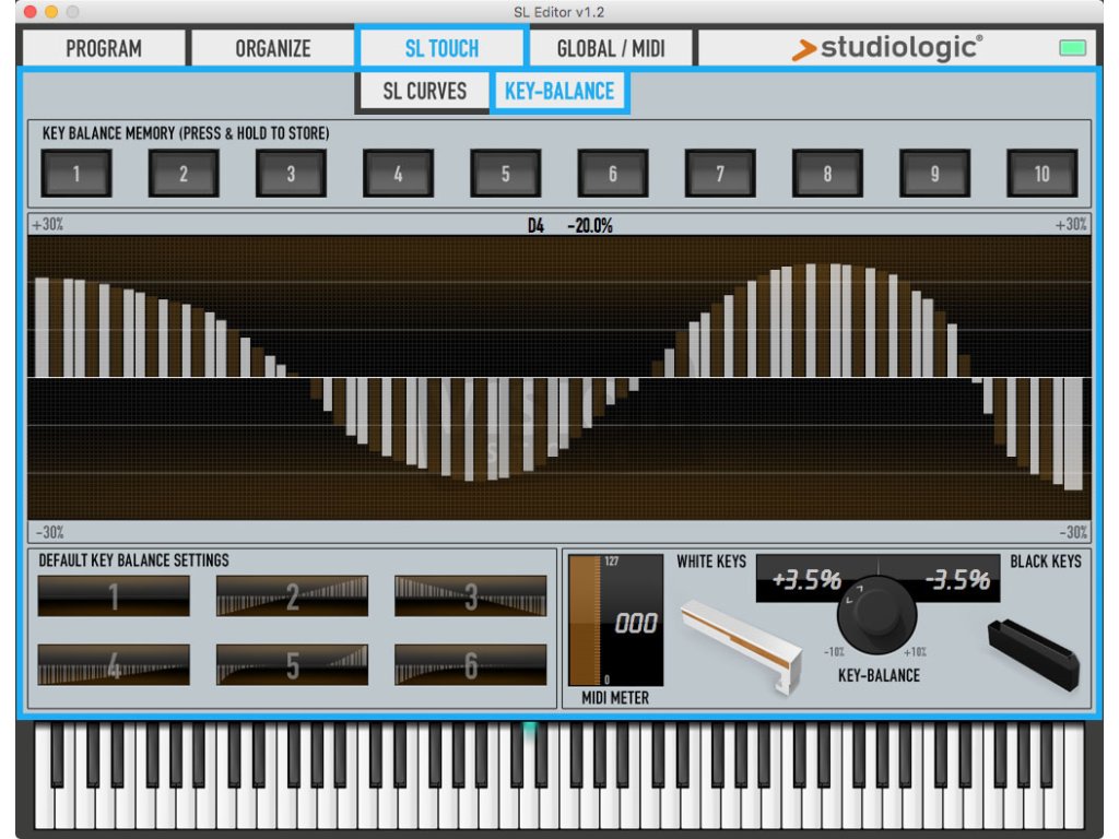 Díky výkonné a jedinečné funkci Key-Balance můžete změnit odezvu každé klávesy, vykreslit nové křivky vyvážení nebo vyvážit poměr mezi černými a bílými klávesy s jediným ovládačem pomocí vizuální zpětné vazby MIDI Meter. Přetáhněte jednotlivé klávesy na požadovanou hodnotu na řádku Balance Line. Nebo nakreslete úplně novou křivku přidržením tlačítka při pohybu kurzoru po celé oblasti Balance. Výsledek se ihned projeví i na vašem SL88.