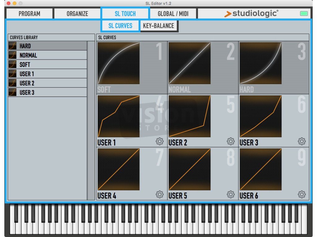 Jednoduchým dotykem na tlačítko SL změníte, načtete nebo upravíte interní rychlostní křivky podle nastavení a předvolby přehrávání. Výchozí křivky Soft/Medium/Hard navržené přímo společností Studiologic můžete rozšířit o svou vlastní, vytvořenou do posledních detailů. Můžete začít od nuly nebo importovat křivku, přizpůsobit je vašemu stylu a konkrétnímu nástroji a uložit ji do jedné ze 6 uživatelských pamětí.