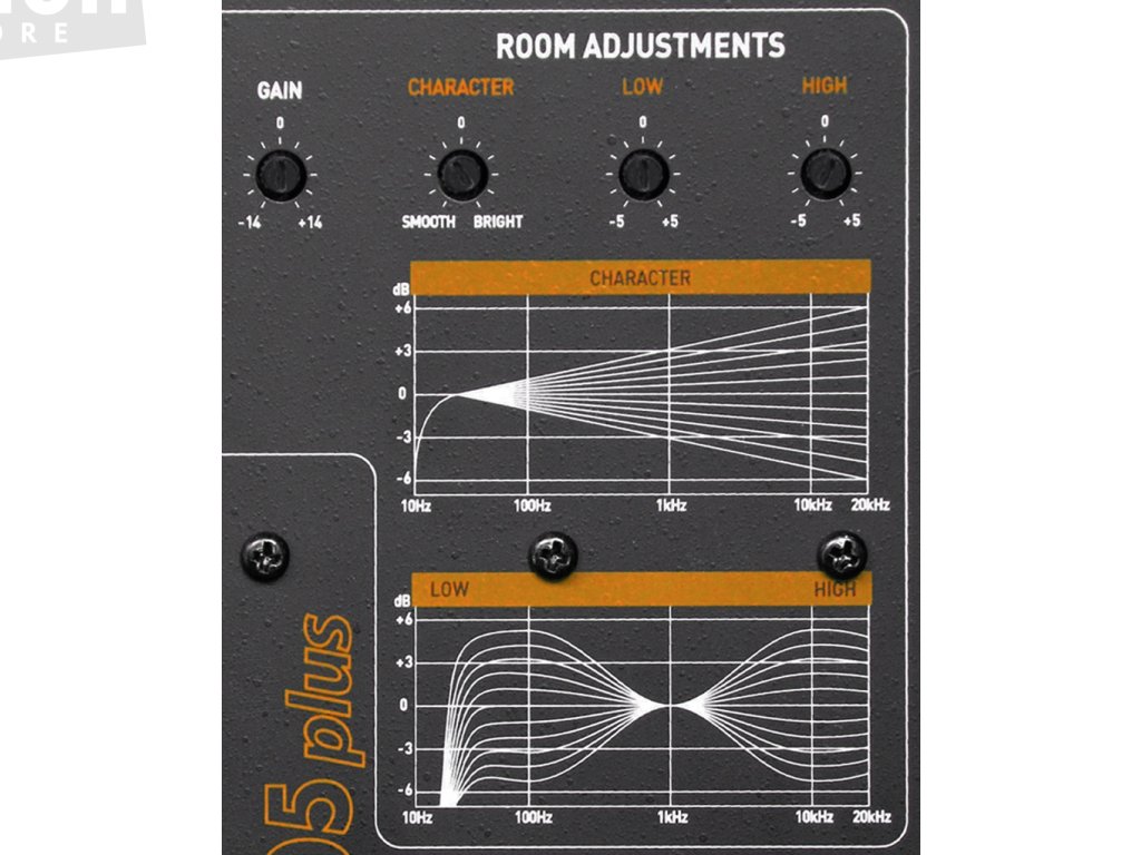 - ovládač korektury místnosti: Character: -6 .. 0dB .. +6; Low: -5 .. 0dB .. +5; High: -5 .. 0dB .. +5